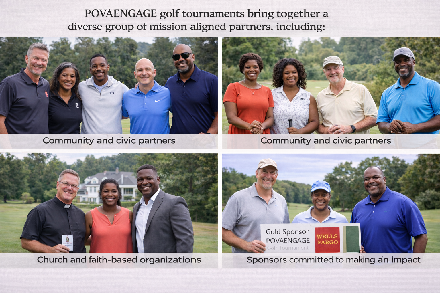 POVAENGAGE golf tournaments are designed to bring together business leaders, faith communities, and local organizations around a shared purpose. These events go beyond competition—creating space for relationship-building, generosity, and community investment.
